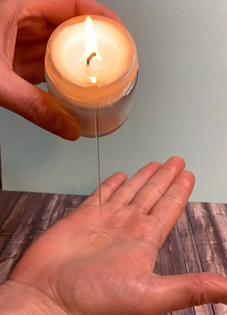 Allumez la mèche pour faire fondre le baume. Au bout de 10 min, éteignez la mèche et verser l’huile tiède dans la paume de la main et massez.